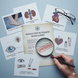 Complicaciones Diabéticas que justifican la Pensión de Invalidez. La Pensión de Invalidez no se concede automáticamente por la Diabetes, sino por el grado de limitación funcional permanente e irreversible que provocan sus complicaciones crónicas y graves en la capacidad de trabajo. Las complicaciones más determinantes incluyen nefropatía terminal (Diálisis), retinopatía (Ceguera), neuropatía severa (dolor o disfunción autonómica) y cardiopatía o enfermedad vascular periférica avanzada. La evaluación se centra en el daño orgánico avanzado y su impacto real y significativo en la pérdida de la capacidad laboral, requiriendo generalmente un porcentaje de menoscabo ≥50%.
