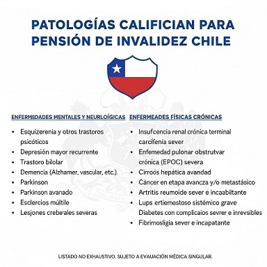 La frase plantea una interrogante clave sobre la seguridad social en Chile, buscando identificar las condiciones médicas específicas que garantizan el acceso a la Pensión de Invalidez. Es una Consulta fundamental que apunta a los criterios de elegibilidad del sistema previsional, un tema complejo donde el foco está en la pérdida de capacidad de trabajo (igual o superior al 50%) más que en un listado taxativo de enfermedades.